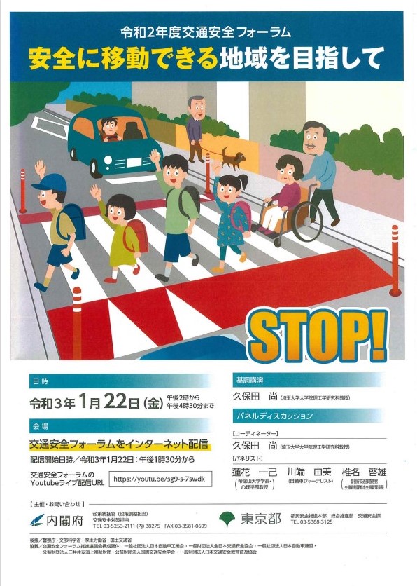 令和3年1月22日(金)、東京都において、新型コロナウイルス感染防止のため、観客の入場はない代わりに会場の映像をYouTubeで同時配信する形で、令和2年度交通安全フォーラムが開催されました。 令和2年度は、「安全に移動できる地域を目指して」をテーマに、基調講演やパネルディスカッションなどが行われました。