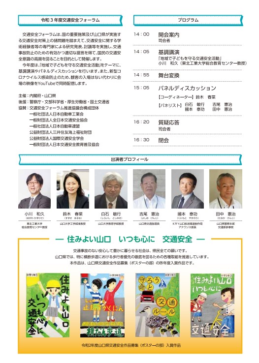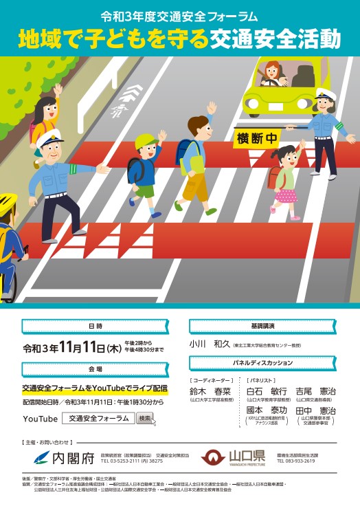 令和3年11月11日(木) 午後2時から、山口県で「令和3年度交通安全フォーラム 」が開催されました。 今年度は、「地域で子どもを守る交通安全活動 」をテーマに、基調講演やパネルディスカッションが実施されました。 昨年度に引き続き、新型コロナウイルス感染防止のため、観客の入場はない代わりに会場の映像がYouTubeでライブ配信されました。