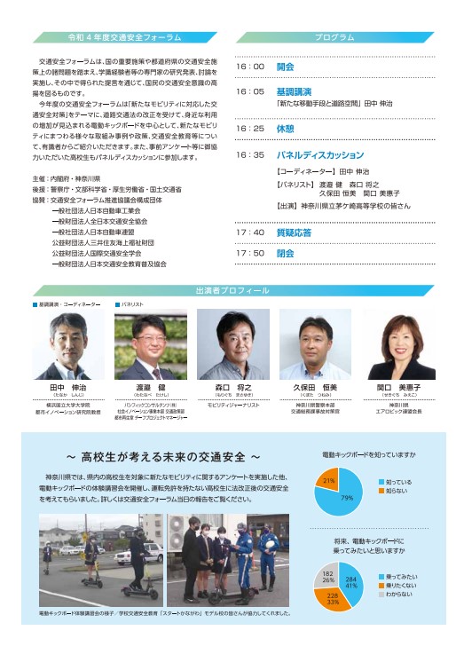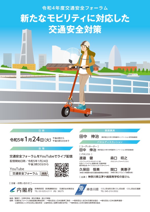 令和5年1月24日(火) 午後4時から、神奈川県で「令和4年度交通安全フォーラム 」が開催されました。 今年度は、「新たなモビリティに対応した交通安全対策」をテーマに、道路交通法の改正を受けて、身近な利用の増加が見込まれる「電動キックボード」を中心として、新たなモビリティにまつわる様々な取り組み事例や政策、交通安全教育等について有識者からご紹介いただきました。また、将来の利用者となると思われる高校生も本フォーラムに参加しました。 昨年度に引き続き、新型コロナウイルス感染防止のため、観客の入場はない代わりに会場の映像がYouTubeでライブ配信されました。