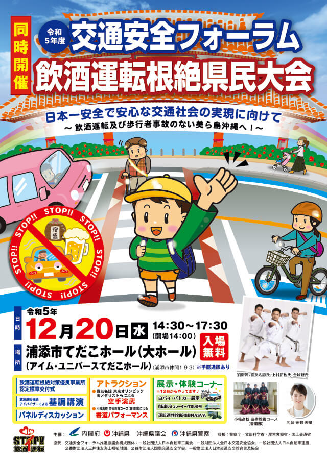 令和5年12月20日(水) 14:30より、沖縄県浦添市で「令和5年度交通安全フォーラム」を「飲酒運転根絶県民大会」と共同で開催しました。 本大会は、沖縄県の交通安全対策上の重要課題でもある「飲酒運転根絶対策」について「飲酒運転をしない させない 許さない」という社会環境の構築と県民の飲酒運転根絶機運を高めるべく、沖縄県では「沖縄飲酒運転根絶条例」が施行(H21.10.1)された翌年から開催しています。飲酒運転根絶や歩行者事故防止など、交通安全に資する有効かつ適切な方法を専門家の意見などを聞きながら皆さんで考えることにより、国民・県民の交通安全意識の高揚を図ることを目的として行います。